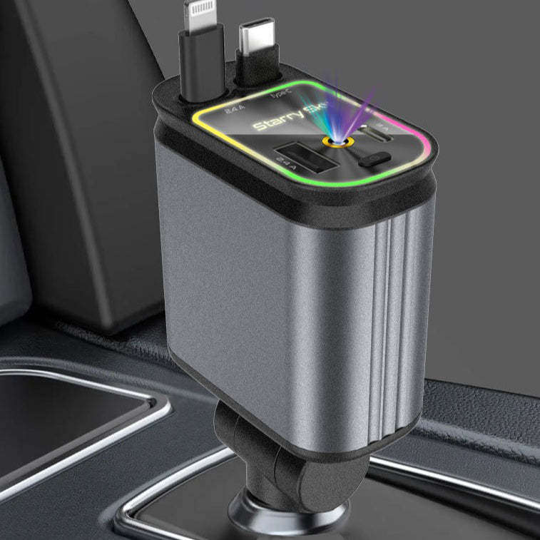 4-in-1 Car Mobile Phone Charger Dual Retractable Cable with Star Top Projection Lamp